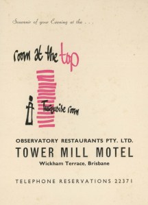 Another dining “event” was a dinner at Brisbane’s revolving restaurant, The Tower Mill[i], named for its proximity to one of Brisbane’s surviving convict-era icons, a windmill which was used to grind grain. The Tower Mill was also a revolving restaurant so was seen as quite “the thing” for a special night out. My very good school friend and I were taken there by her godparents to celebrate graduating from high school. A few years later we celebrated my recently-married husband’s 21st birthday there with his family. A flash dinner out at a restaurant was a rare enough event that photographers came to each table to record the event with a Polaroid camera. Perhaps it was also that not everyone had a camera as well – hard to imagine in these days of digital cameras and mobile phones with cameras. This reminded me of a later trend in some restaurants where people came around selling roses.