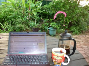 I prefer to start the day  on the outdoor deck/verandah we have – it’s not large but it overlooks the garden and sets the day up nicely. Given our predictable weather this plan works much of the year, except during the Wet, so occasionally I’m driven inside. Plan B: the chair, coffee cup to hand, laptop on the lap.