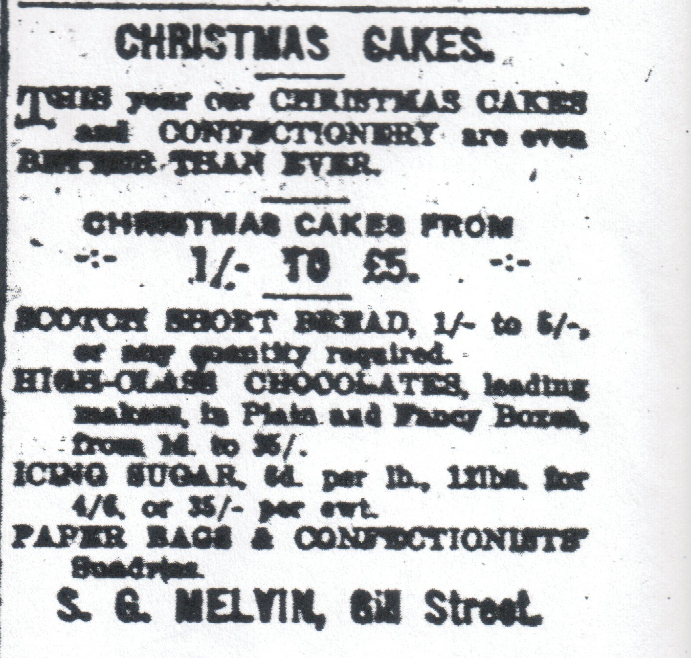 A couple of weeks ago while in the library reading a newspaper microfilm (on inter-library loan) I found a Christmas advertisement for the shop owned by my great-great-grandfather. He was a pastry chef and confectioner, trained in Scotland, so the Scotch shortbread he was promoting would have been the real deal.