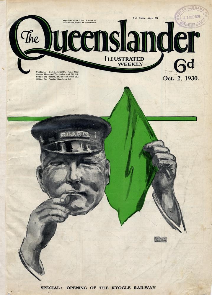 Illustrated front cover from The Queenslander October 2 1930 shows te head and hands of a railway guard. With one hand the guard holds a whistle to his lips and with the other he raises a green flag. John Oxley Library Image 702692-19301002-s001b. Copyright expired.