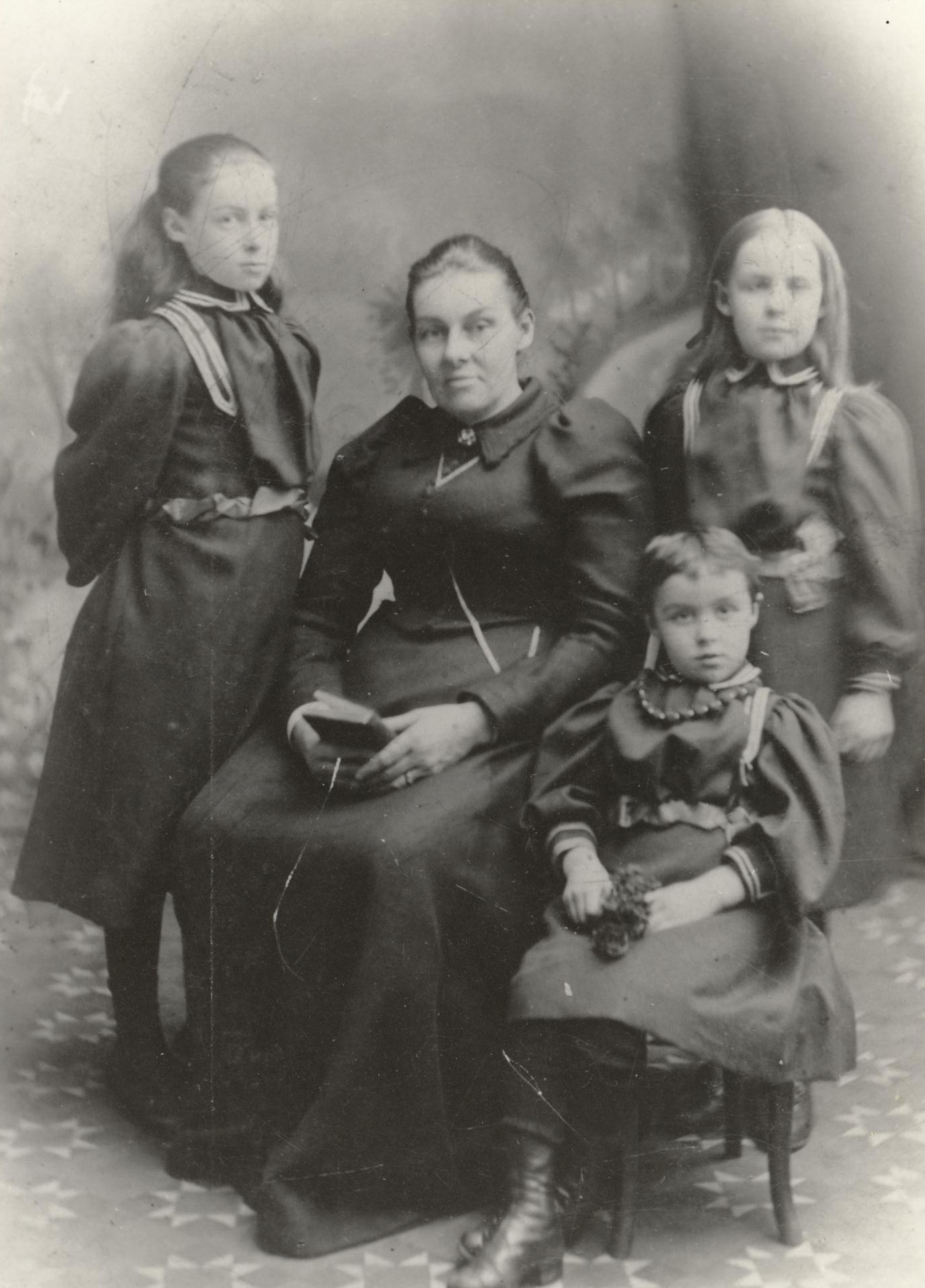My grandmother, a girl on the verge of young womanhood, looks at us sidelong from her position beside her mother, yet her gaze is direct and intense. I see echoes of myself in this photo, taken when she would have been about 12. This makes it likely that the photograph dates from around the time of the 1901 census, when the family was living at 3 Bolton Drive, Mt Florida, Glasgow. Catherine McCorkindale, second daughter and sixth child of Duncan McCorkindale from Argyllshire and Annie Sim from Bothkennar in Stirlingshire, was usually known as Kit by her family, yet on this census she is called Katie, obviously her childhood name.