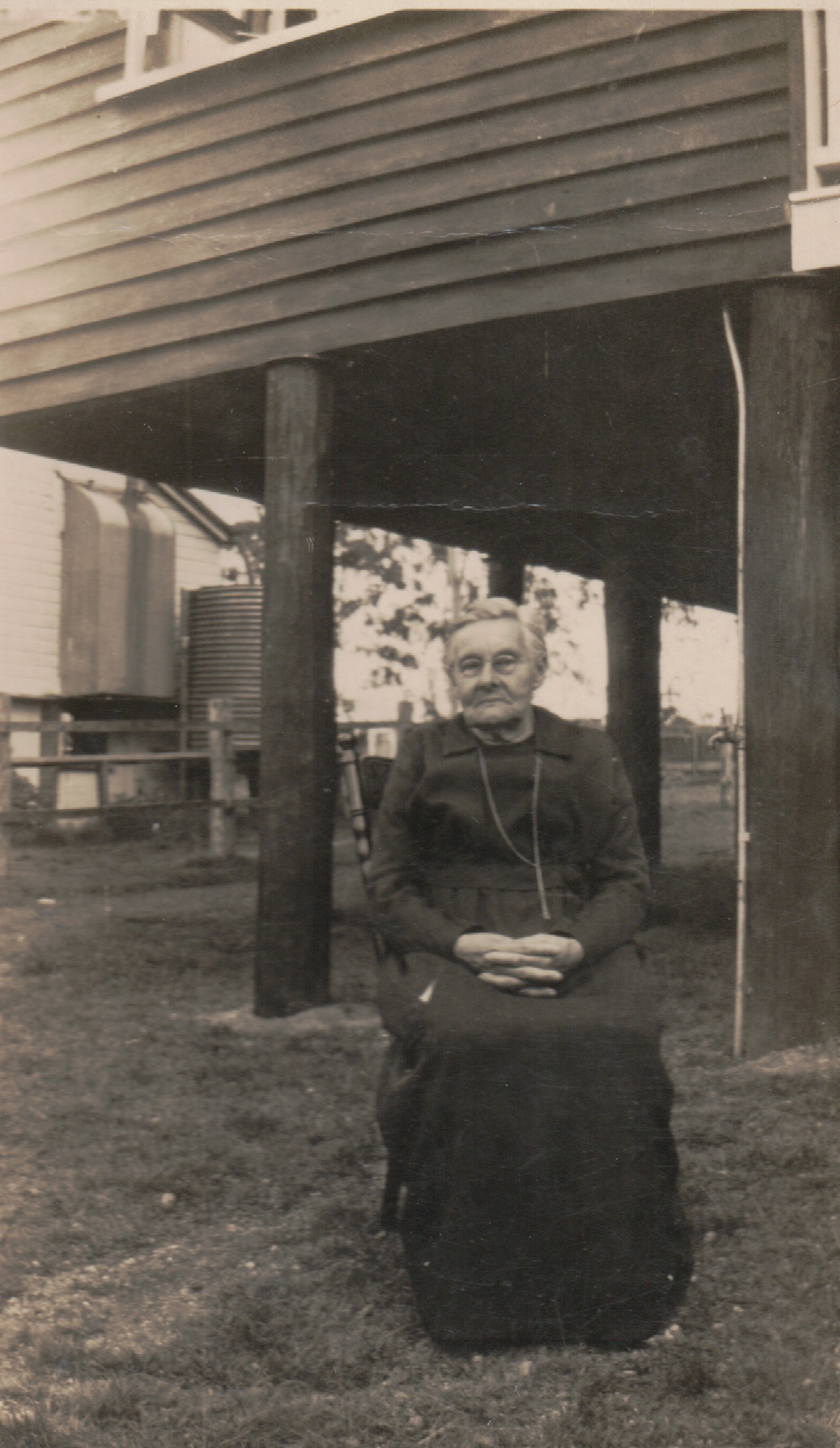 Annie Sim McCorkindale in her old age, near their house in Brisbane. Do you think this might be the same dress revamped? The chain looks the same to me.