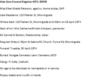 If the undertaker is from your home town, then you may have the added advantage of knowing that certain funeral directors were more likely to be chosen by particular religions eg KM Smith was the dominant funeral business for Catholic Brisbaneites. But don’t get wedded to which company they may have used, as they’re likely to upset the apple cart (as you’ll see from the funeral notice here, for my Presbyterian relations).