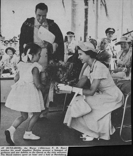 Official welcome to the Queen to Bundaberg 1954. SLQ image from the Australian Womens Weeklyoai:bishop.slq.qld.gov.au:423633 Copyright expired.