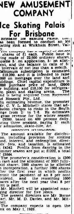 Had Brisbane ever had an ice rink before Mowbray Park I wondered? Trove was more helpful with this query revealing there had been grand plans for an Ice Palais in Wickham St, Fortitude Valley opposite McWhirters in 1938. Trove gave me the proposed building design (above), Council approval, and an advertisement. Sydney had its Glaciarium and Brisbane obviously thought it was time to get in on the fun (or more likely the profits).