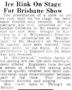Ice revues were popular and just as entertainment events like Disney on Ice have especially set-up ice rinks, so did these revues held at the old His/Her Majesty’s Theatre. I thought it was interesting that the revue was timed to coincide with the annual Ekka when all the country people were in town, thereby maximising the potential audience.