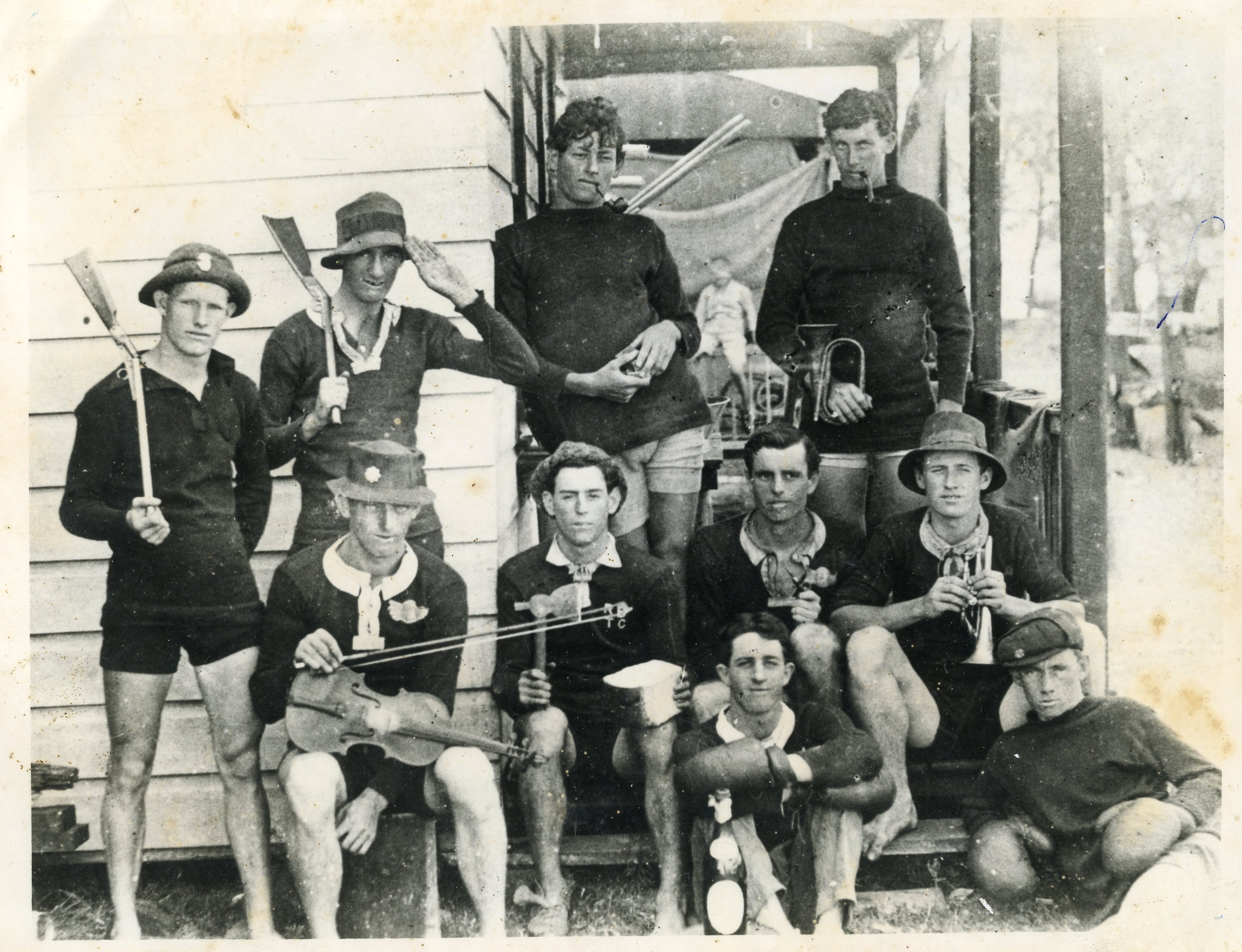 The Red Bicycles Touring Club was a cycling club based in Brisbane. From the stories I read it was part fun and definitely a large slice of seriousness. They were incredibly fit, riding in bike races, swimming, running, playing water polo, boxing and diving, interspersed with fun like blindfolded boxing! However they also had a club house at Cleveland, which is on Brisbane’s outskirts and on Moreton Bay. which they used for weekend camps of increasing popularity. I’m guessing that’s where this photo was taken hence the sky-larking element of it. It may even be from the December 1913 camp mentioned in The Queenslander.