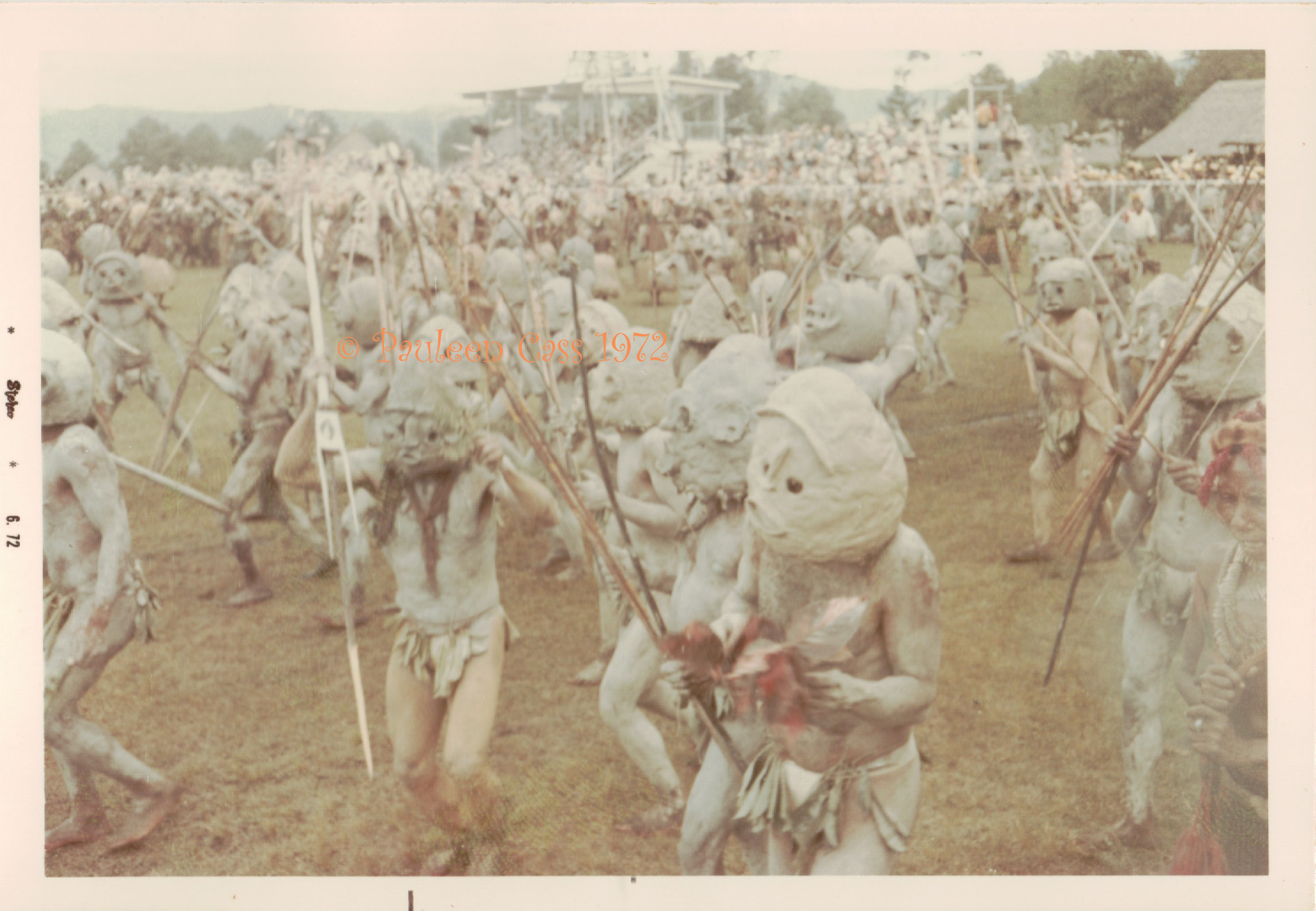 Memories of coastal villages, mountains and mountain valleys and passes, semi-naked people dressed in elaborate costumes. The unique smell of pig-grease spread on the skin to keep out the cold, blended with smoke from a chimney-less hut. Women loaded down with kau-kau[ii] in their bilums[iii]. The blood-red stain of buai spit on the ground. The sounds of the kundu and the ululation of chanting during a sing-sing.