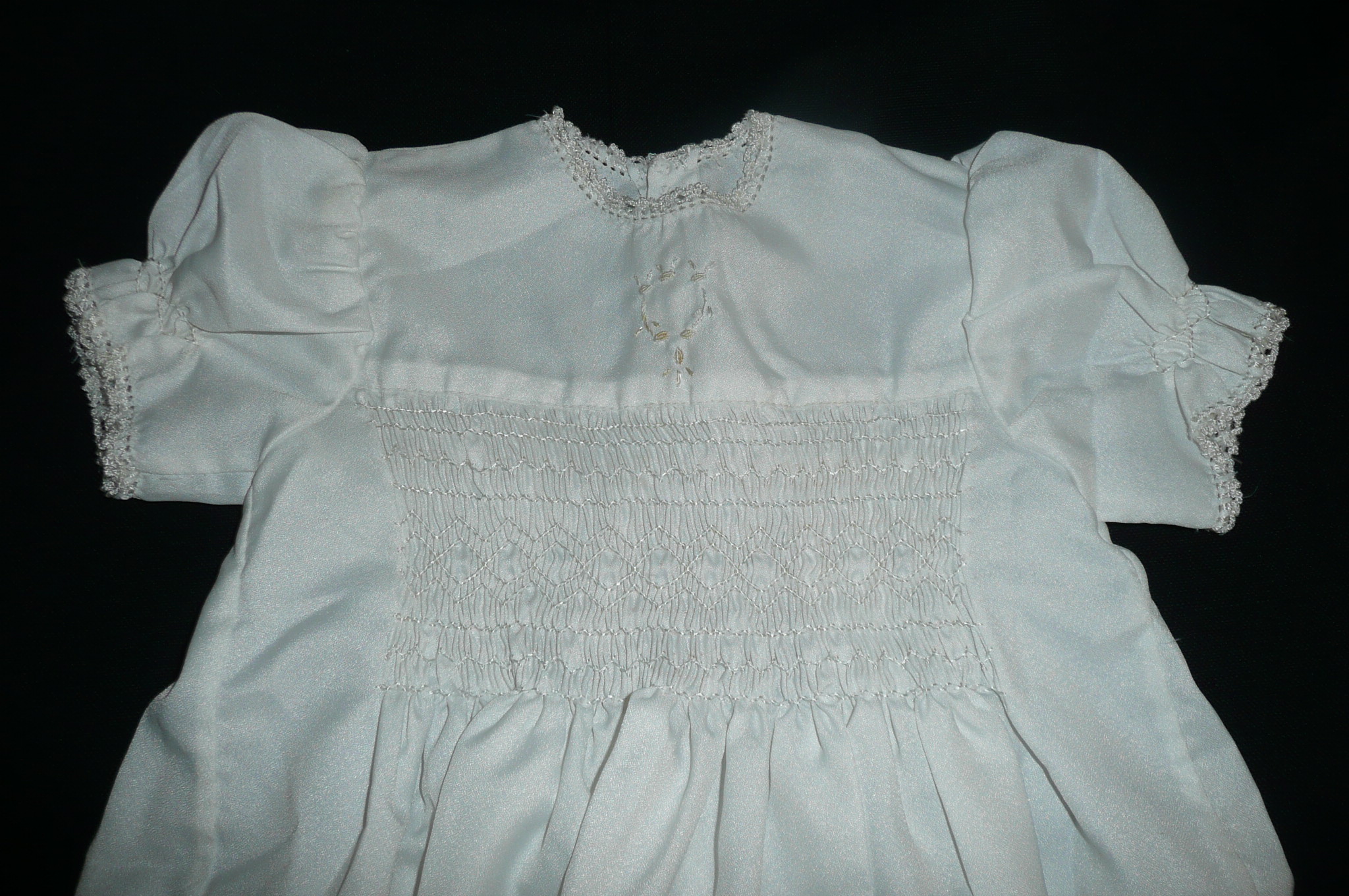 Her christening frock was one of the earliest creations on my new Bernina. The beautiful hand smocking was done by my mother and I have the notion that I did the crochet despite my lack of expertise. I should check to see if Mum can remember, perhaps she did it.. I checked with her today and she’s not sure either. I’m thinking now it’s more likely to have been her work. She also had a special crocheted coat, bonnet and bootees outfit that I think my parents bought her for the occasion. Our other daughters wore the christening robe also in their turn, one in Goroka and one in Brisbane.