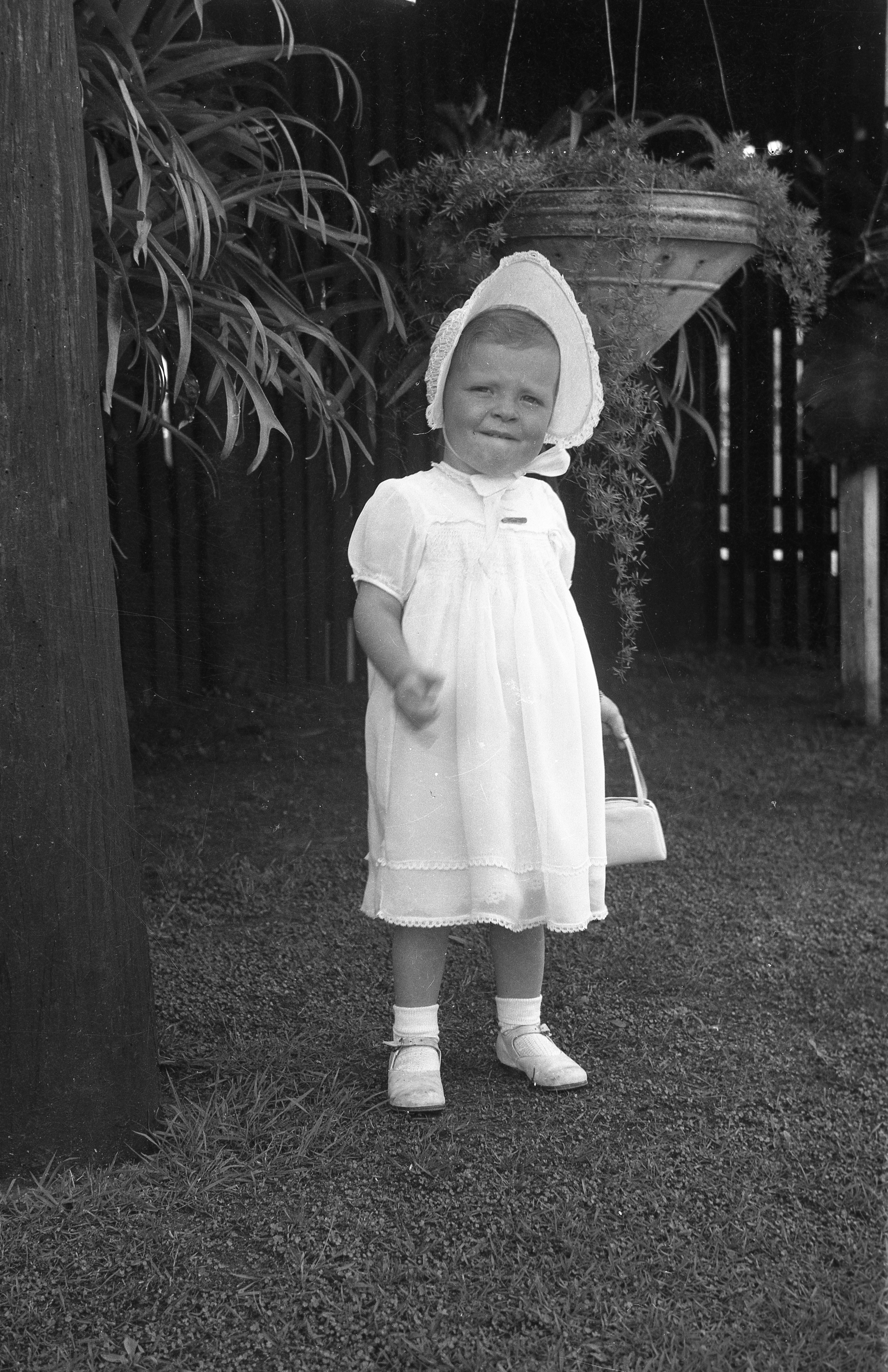 Among my baby book photo is this one of me wearing my own christening dress. It certainly wasn’t taken when I was christened so it must have been a good deal larger than necessary when I first wore it. I also have this frock in my possession even though it’s quite fragile being made of a type of chiffon. Mum tells me my Aunty Mary (whom you met last week) made this dress for me, with specially covered seams to meet my grandmother’s critical professional dressmaking standards.