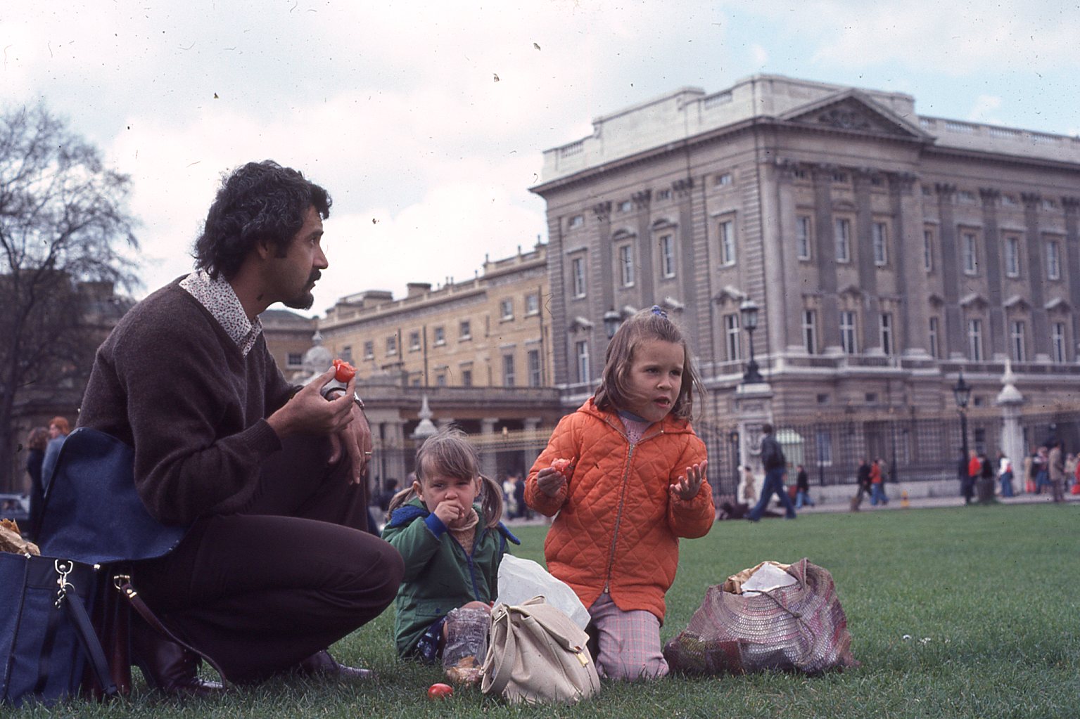 This may have been our classiest picnic -across from Buckhingham Palace on our 1977 trip. Mr Cassmob and our two darling daughters (henceforth DD1 and 2).