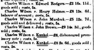 Further research of Trove revealed at least part of the cause. George was being pursued for dishonouring a £6 promissory note as well as the cost of goods purchased (but presumably not paid for!) of £8 2s 6d. In both cases Wilson was claiming 5 shillings costs, so another £1 to add to the original £14/2/6.