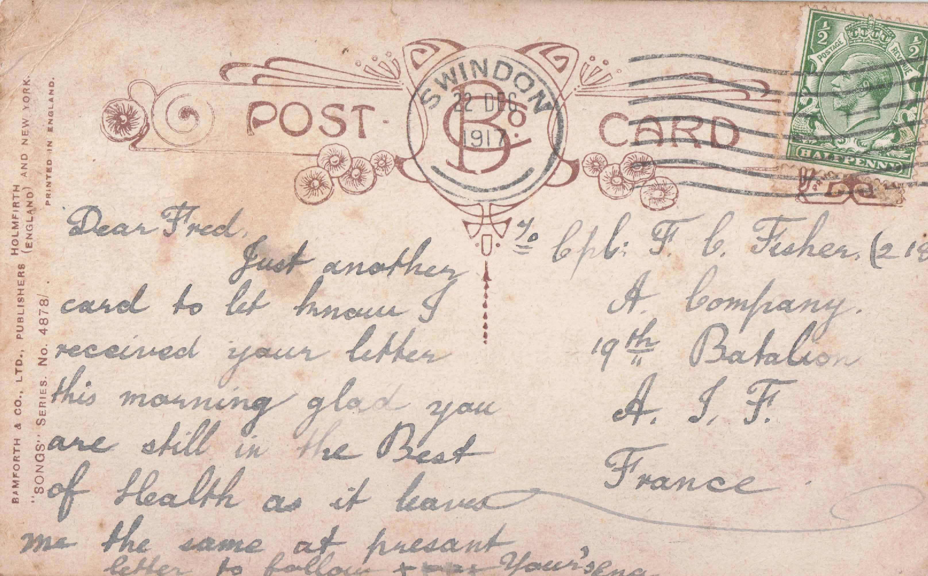 This postcard, from “Ena”, is dated 22 November 1917 and posted in Swindon, England.