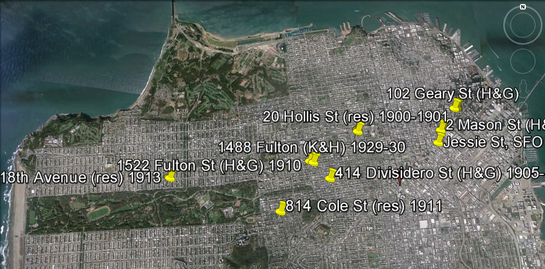 By 1896 Charles had moved to 20 Hollis Street and Happ & Gingg to 102 Geary (1900-1905). Obviously Hollis Street suited Charles as his next move was up to 64 Hollis. From 1905-1909 Charles is residing at 56 Hollis, only a few doors away but the business moved to 414 Divisadero St in 1907 then 2 Mason (1909-1911).