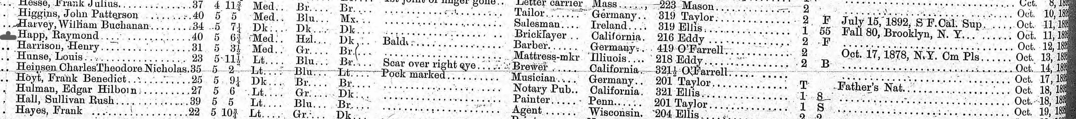 Two years later Raymond Happ was on the voters’ register of the 12th Ward in San Francisco, having registered on 29 July 1875.[ii] In 1888, he is registered as living at 419 O’Farrell St (on the 2nd floor).[iii] The 1892 registers would be something of a gold mine for his descendants as it documents his physical characteristics: he is 40 years old, German-born, 5 feet 6¾ inches tall, with medium complexion, hazel eyes and black hair, though the next entry states he is bald. He is still living at O’Farrell St but his naturalisation date is incorrectly noted as 1878 not 1873.[iv]