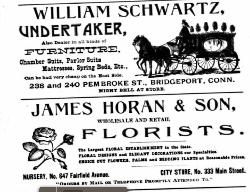 Shortly after, in 1890, he’s back in Bridgeport, once again living and working at J Horan’s florists and nursery at 647 Fairfield Ave. This continues through the 90s as the firm becomes J Horan and Son. It seems throughout this time he’s living on the nursery premises as in 1895 the street directory for 647 Fairfield shows the residents as Charles Barey, Julius Happ, and Louis Wittman all employees of J Horan & Son as well as James Horan, florist and a John Puzak. Also from 1896, Julius is no longer listed as an employee but a foreman.
