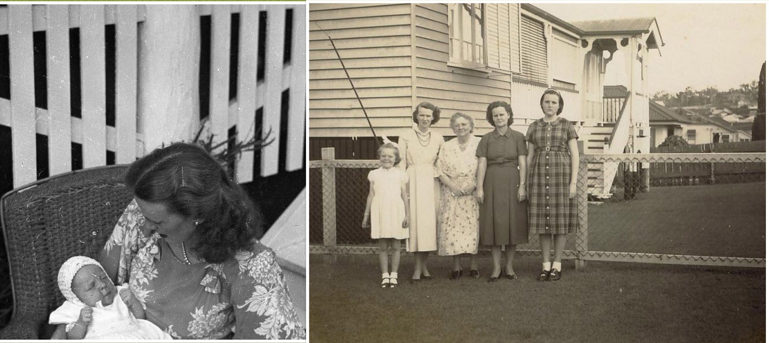 Image 3: left: Mum and I in the same position, and in the same chair, near the stairs of my grandparents’ house; right: me, Mum, my great-aunt Emily, my aunt Mary and cousin Patsy, with the stairs in the background.
