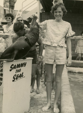 Apart from the attraction of sun, sand and surf at Greenmount, one of the big “pulls” during the 1960s was the Porpoise Pool run by Jack Evans at nearby Snapper Rock. It was de rigeur to visit the attraction and see the trained dolphins leap from the pool to catch their fish. (You can see a video here). Afterwards it was almost inevitable to have a photo taken with Sammy the Seal, another feature of the attraction. In this photo of me I would have been about 12. I remember that rainbow top, which Mum sewed, very vividly especially the texture of the fabric.