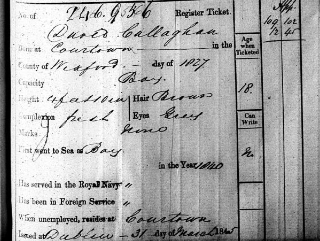 One possibility is that David Callaghan senior first went to sea with the merchant navy in 1840. Certainly there is a David Callaghan, aged 18, ticketed in 1846. He was an apprentice, from Courtown and had gone to sea as a boy. He is described as 4ft 10ins, brown hair, grey eyes, fresh complexion and no marks. What stands out for me here is the lad’s height as his daughter was quite tall but perhaps he hadn’t grown fully, or it is the wrong person, or a cousin….or….The anomaly is the variation in his year of birth.