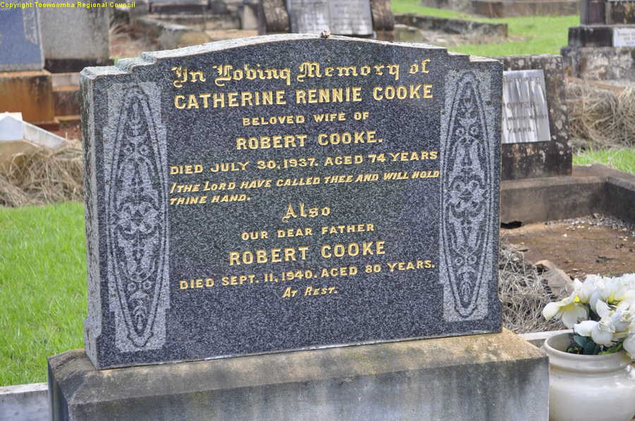 Catherine Rennie Marshall (note name difference) married Robert Cooke in 1882 (Qld C6797). Their daughter, Margaret Elizabeth Cooke, was born in 1882 (Qld C6797). Catherine Rennie Cooke died on 30 July 1937 (Qld C3666) and is buried in the Toowoomba and Drayton cemetery.