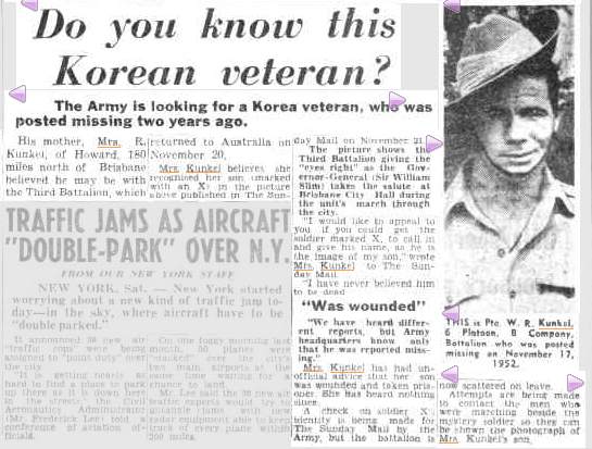 Recently I was searching Trove and came up with another news story about Robert Kunkel. It was a very big entry on page 4 of Brisbane’s Sunday Mail on 12 December 1954[i]. Robert’s mother, Hilda, plainly believed that it was her son seen in the march-past at the City Hall of the 3rd Battalion, recently returned from Korea, even though he’d served with the 1st Battalion. As a child I always heard that Robert had never returned so it’s plain that the man marked didn’t turn out to be her son. What a sad loss it was for Robert’s parents, Hilda and Bill, who never stopped missing their son.