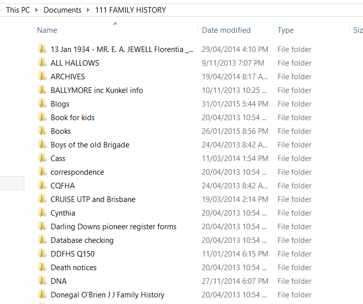 This is where I start to come to grief more often than with hard copies. Once again I have all my families in one folder “111 Family History” which places it at the top of my file directories. Within that folder I have sub-folders by surname and in particular cases, by place or research topic. If the information regarding place is specific to one family I file under that name.