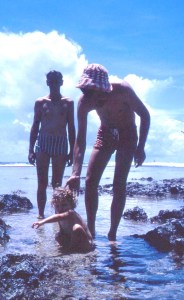 Louisa in rock pools at Wewak with Peter and Les 1973