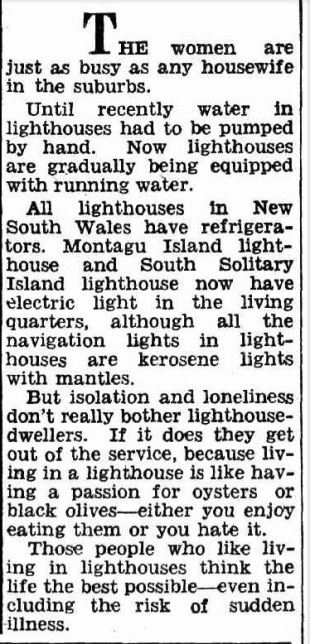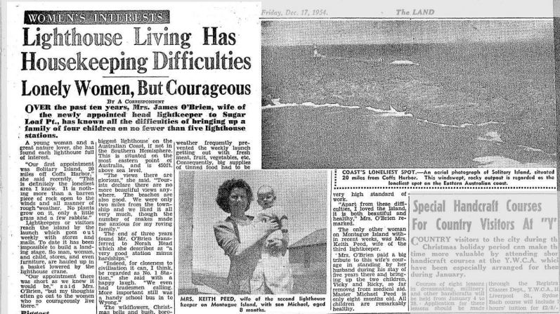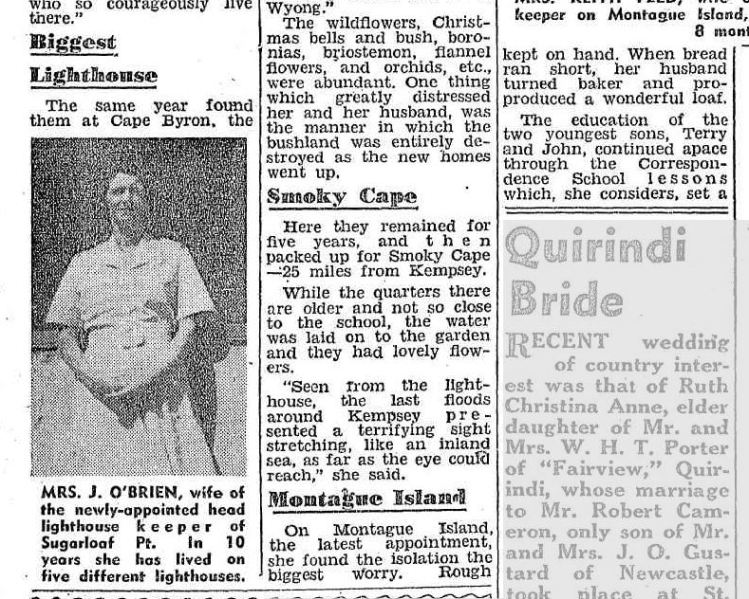 The most exciting article I found as I trawled Trove is this one about a related family of mine. How amazing to have a word-of-mouth description of the family’s life. The mother was quite right to be concerned about her children and the snakes, because unbeknown to her, the kids were capturing snakes and selling them. You can read the whole story here since the images are not all that clear.The family’s oral history says that Mrs O’Brien turned on the Cape Byron lights when it became automated in 1986, and this article explains that her husband, James O’Brien then Head Lightkeeper, turned the switch when it was converted to an electrically operated light in 1959.