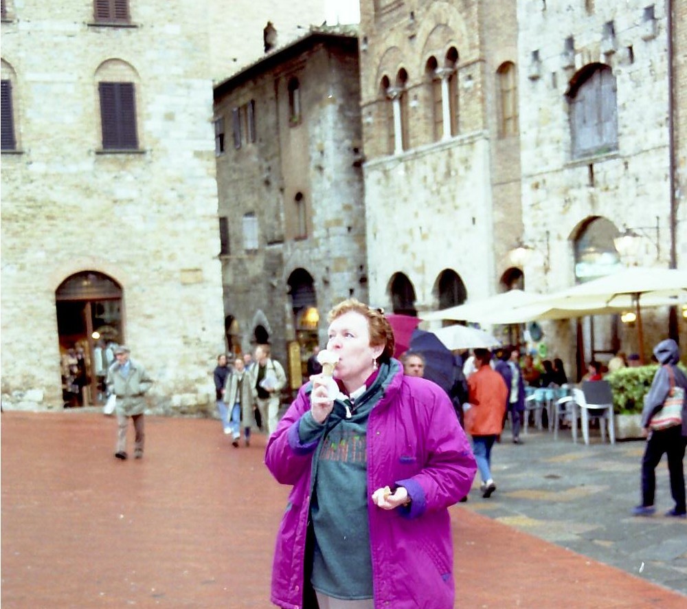 Fulfilling an ambition to eat gelati while listening to the midday church bells at San Gimignano, Chianti.