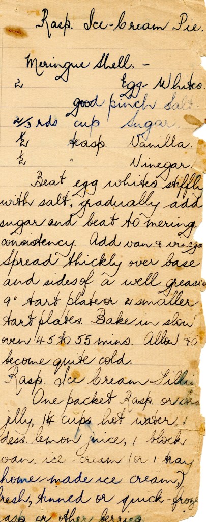 I found this recipe for a Raspberry Ice Cream dessert among mum’s collection but I have no recollection of it ever being made. Probably like most of us, she’d collected the recipe then decided it was too much bother.