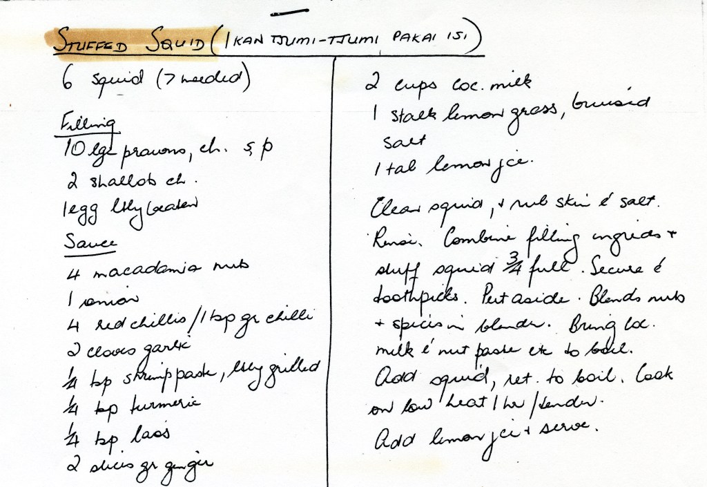 Struggling to come up with an “I-name” food we’ve eaten in recent years I consulted the current chef whose helpful reply was “I don’t know” then “we’ve never made iguana soup”. Thus supported, diverted or frustrated, I had another trawl through my recipes and came up with these two: Indonesian Salad or Gado Gado, and Ikan Tjumi Tjumi Pakai (stuffed squid). In our early married days I made the stuffed squid a few times but I confess it all seems like too much bother these days and have only made it once or twice since.