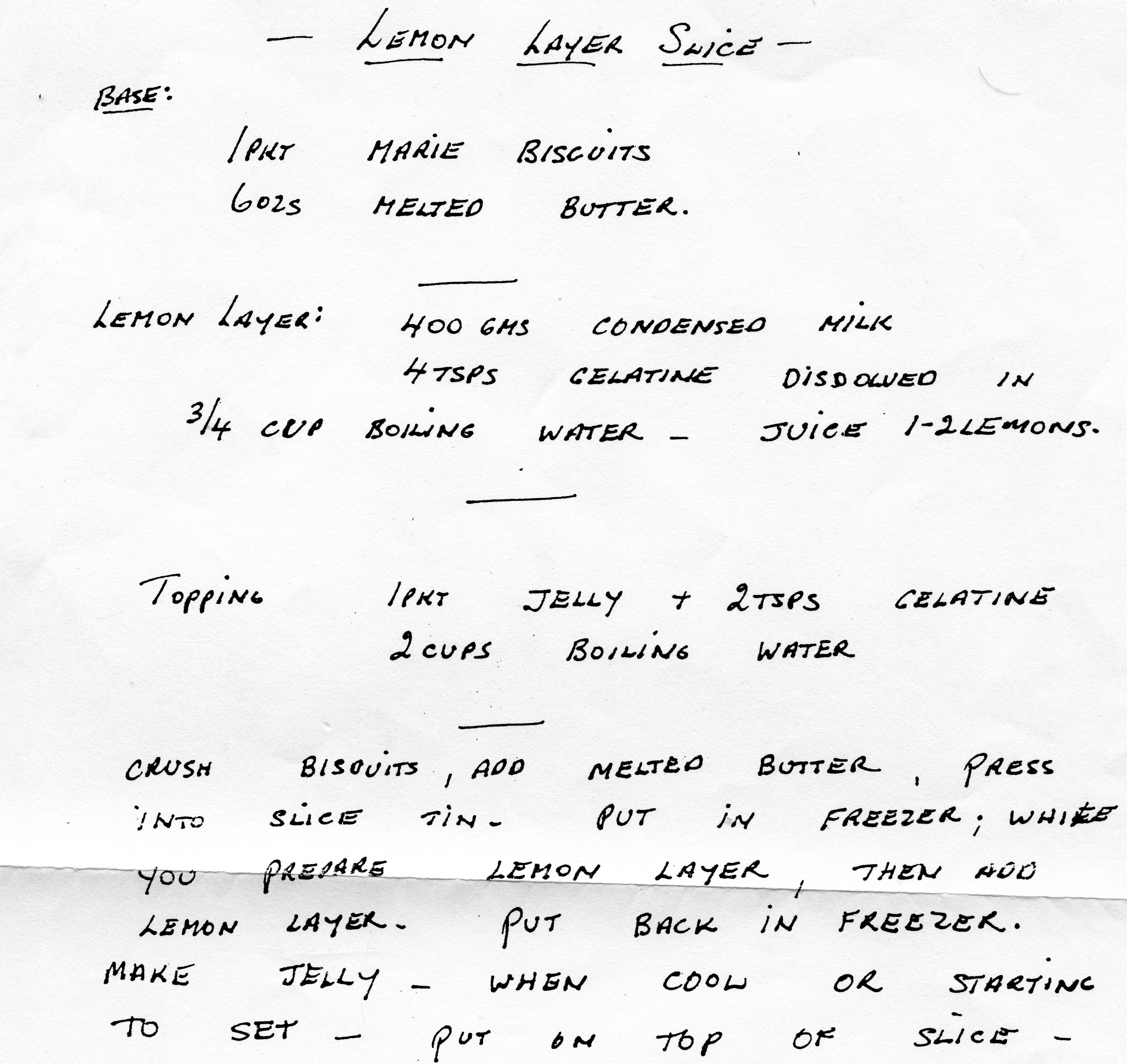 Biscuit slices remain popular over the decades and a one that holds an emotional and culinary place in our family’s heart is the Lemon Layer Slice by our friend Dawn. It is so tied to memories of her bringing it to gatherings that we call it “Dawn’s Famous Jelly Slice.