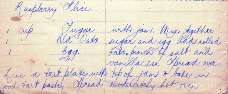 I remember that mum used to make a jam slice with a coconut topping which was very nice and which is still commonly seen in cafes even today. I found her recipe tucked away under Raspberry Slice where the raspberry ingredient is jam.