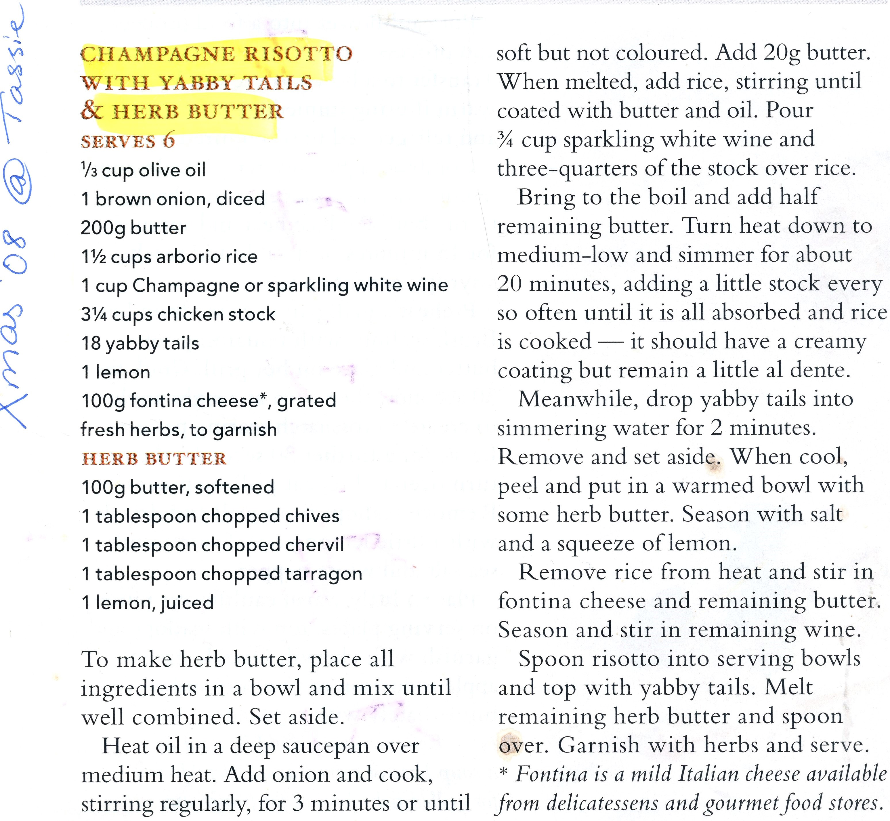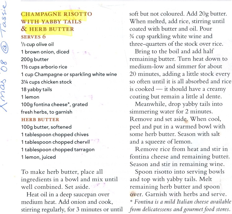 The pièce de résistance of our Y recipes is the Yabby Tails with Champagne Risotto that eldest daughter cooked for us on Christmas Day 2008 at the Freycinet Peninsula, Tasmania. Our entrée was scallops with cauliflower and tapenade and the meal was accompanied by delicious Tassie bubbles. Dessert was fresh Tasmanian berries. Delicious! The seafood had been pre-booked from afar and was fresh from the coop on Xmas Eve, so the entire meal was simply spectacular and will remain a very special memory, both of a meal and time together.