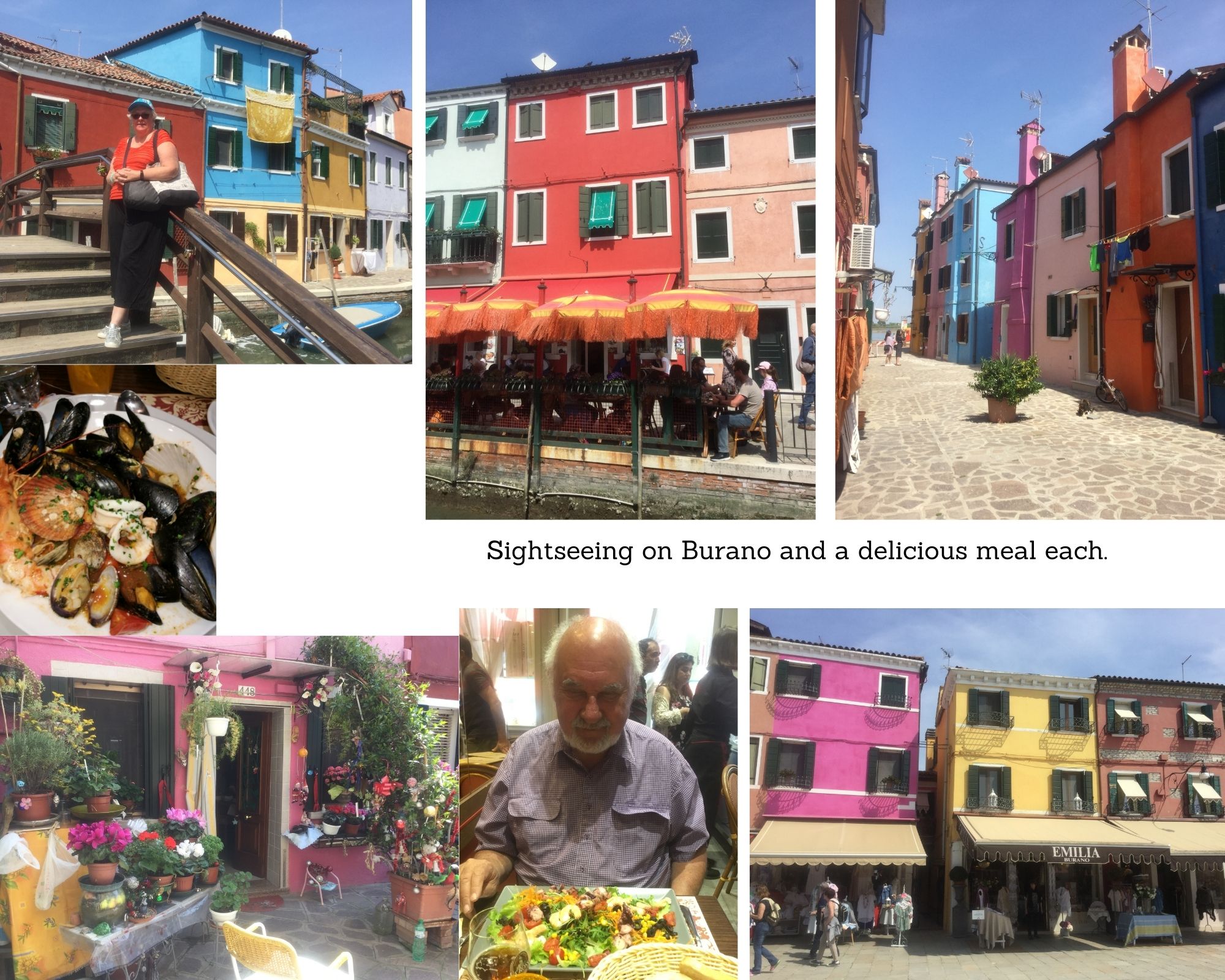 I was so disappointed to be sick during our most recent visit. Three things were different for us on this trip: for the first time we stayed in the centre of Venice rather than Mestre; we arrived by plane from Barcelona via Rome, rather than train; and we committed the financial “sin” of having coffee right on the Grand Canal <gasp>. We did get to Burano on the final day, as I was feeling a bit better having spent the previous day in bed. Sadly, Mr Cassmob had even had to take himself off to a concert without me but he coped <smile>. It was fun being able to walk to San Marco, and see the area with fewer tourists/crowds. We had dinner a couple of times at a little place nearby, beside a canal. And from our bedroom window we could see and hear the gondoliers taking their passengers up the tiny canal. True to one travel plan, we have never yet been in a gondola, though I have a photo of mum and dad on one.