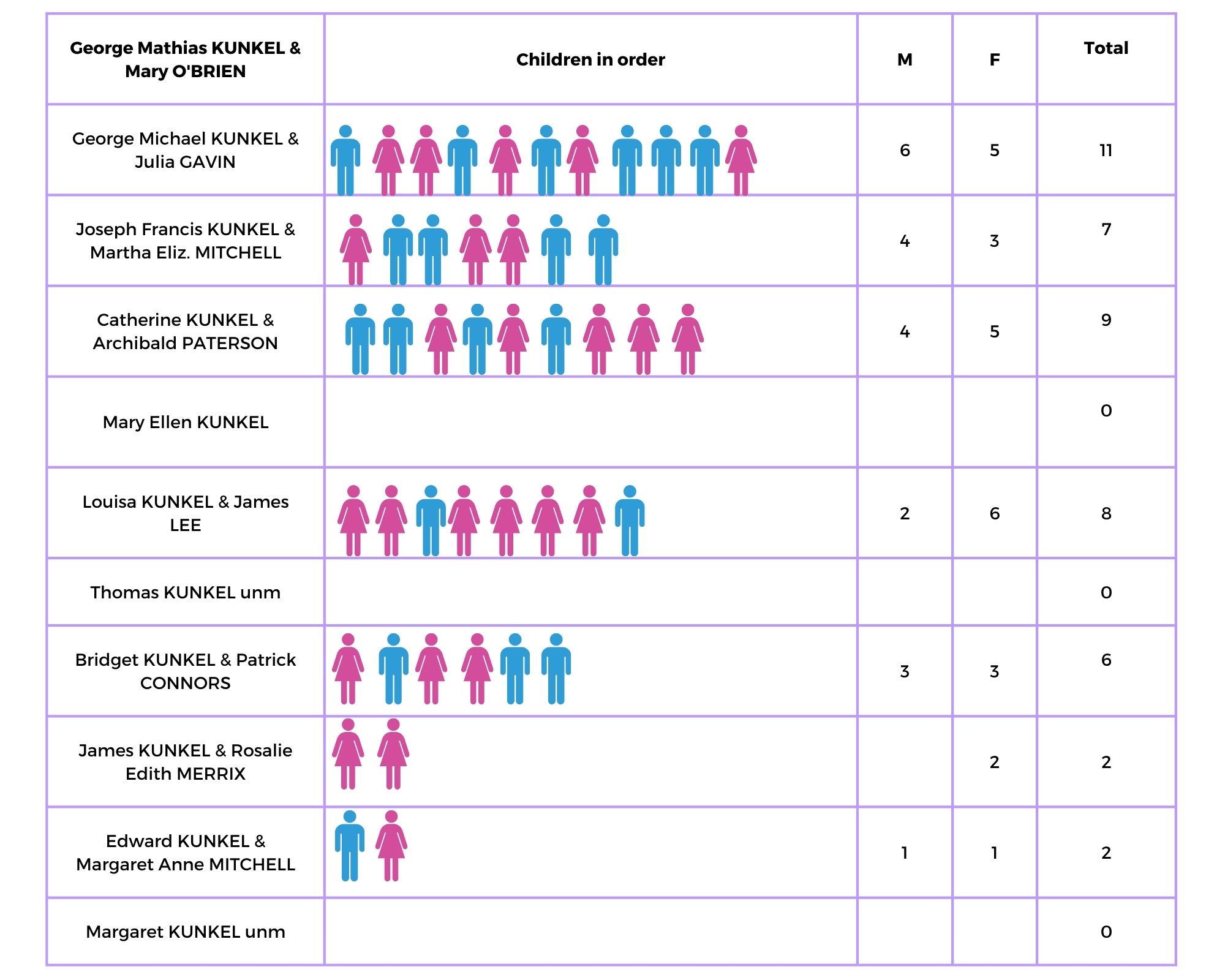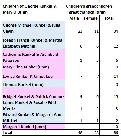Great grandchildren of George Mathias Kunkel & Mary O’Brien by gender.