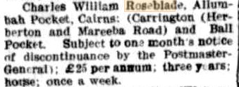 I was pleased to find this delightful image of Lucy and John’s son, Charles William, commencing his mail run c1905 via Trove. (2014). Charles William Roseblade commencing the mailrun over sixty Russell River Goldfields, Queensland, ca. 1905.
