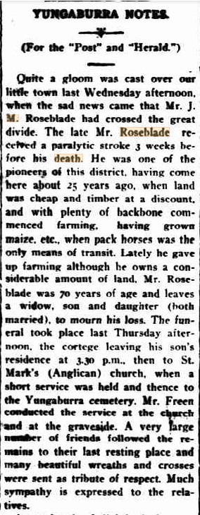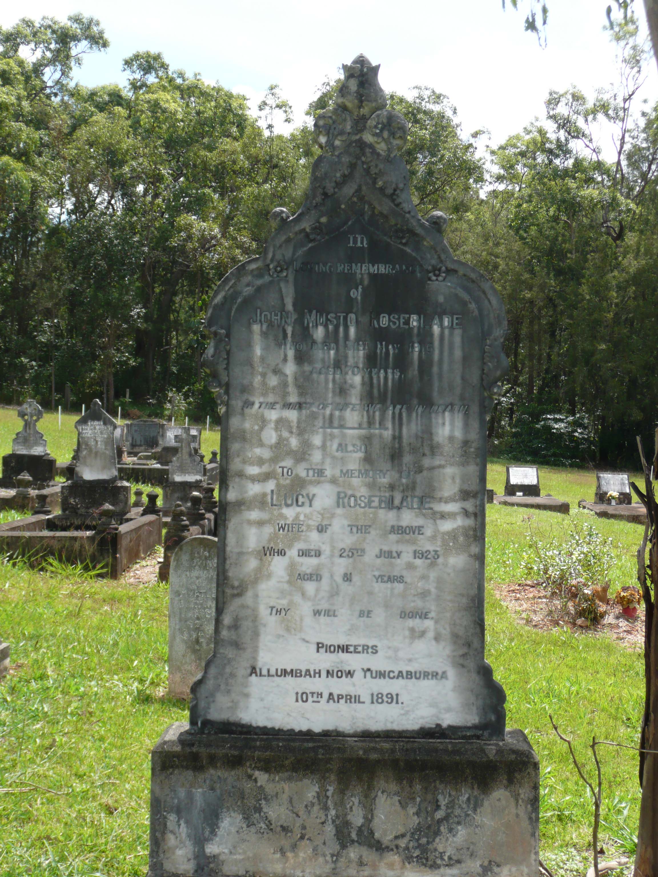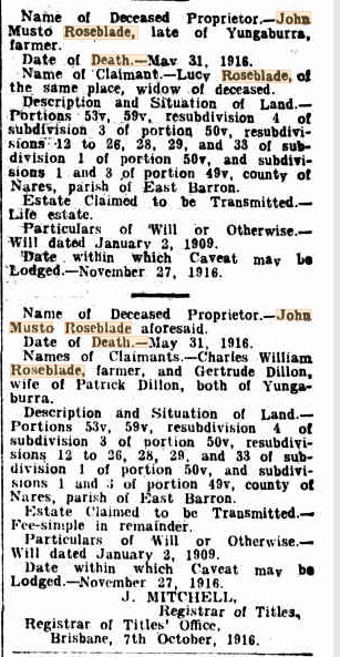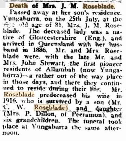 The Roseblades arrived in Queensland in 1886 on the Duke of Westminster with their children, Charles 11, Lucy 8, Gertrude. John Musto stated his occupation was a mason and that all the family came from Wiltshire (well, not Lucy).