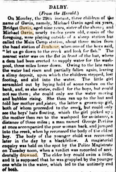 Among my earliest family history discoveries was the story of two boys who drowned on Jimbour station back in its early days[iii]. The  were cousins aged 12 and 6 and both named Michael Gavin. The inquest[iv] identifies the parents of Bridget and the younger Michael as Stephen and Anna (aka Honora Mulkerrin) Gavin. The twelve year old Michael was the son of Mark and Anna Gavin.