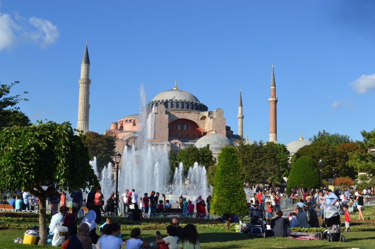 Family groups gather in the park in front of the Hagia Sophia Grand Mosque.