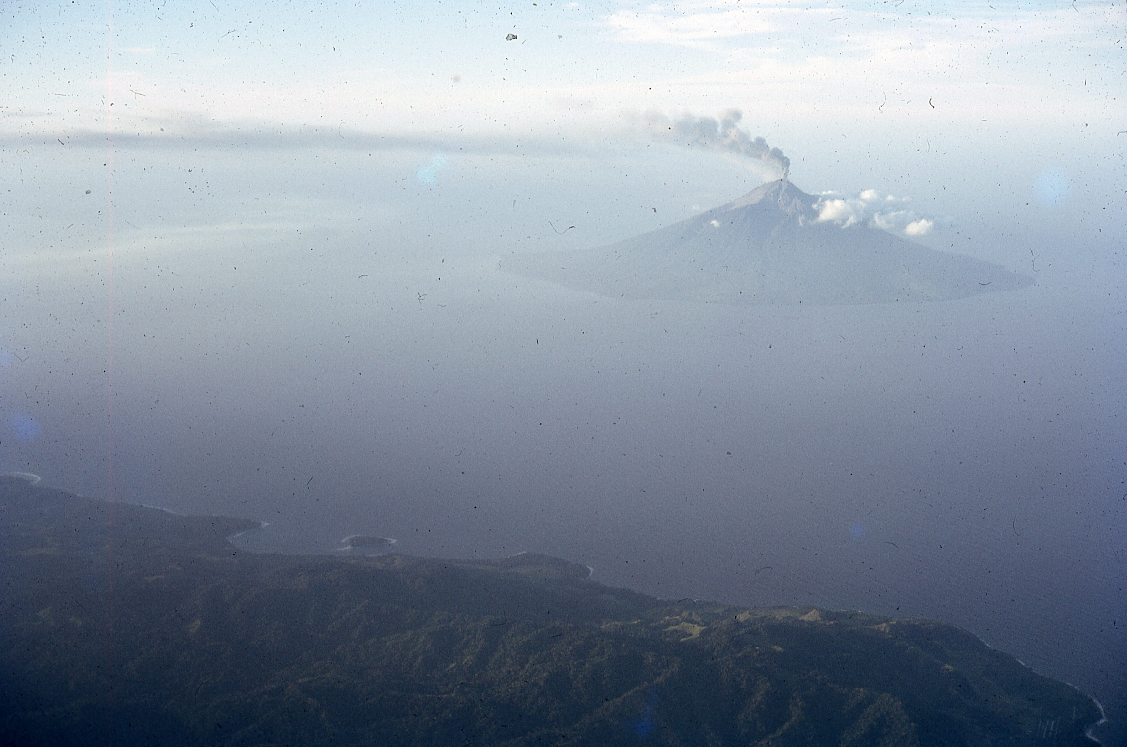 The local volcano having a bit of a puff at Madang as we flew in, 1975.