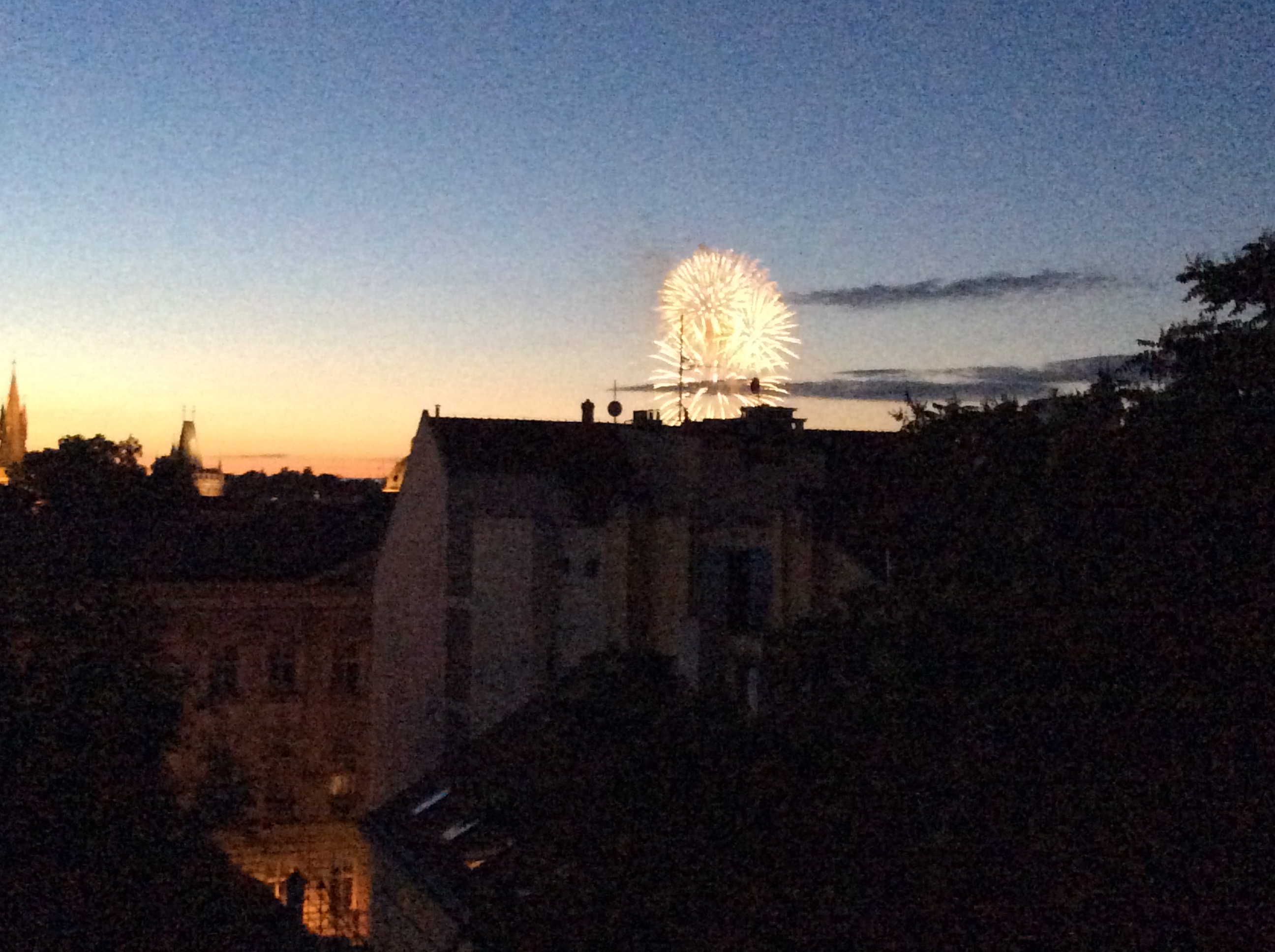 Our 2014 flight to Prague took us from Paris via Frankfurt with Lufthansa (LH), arriving about 11pm. “Our view of the full moon and the city lights as we came into land was spectacular, and no less pretty over the city’s many spires as we drove to our accommodation”. A couple of nights later, we were surprised to see fireworks burst into the sky. Travel doesn’t offer special treats like that very often.