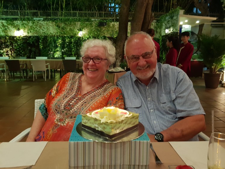 Even though it’s only six years since we were there, this is another airport that is a blank in my memory. I’ll leave you with a photo taken on our last night in HCM, when our tour guide presented us with a cake for our anniversary…my black eye is from falling flat on my face in Hue.